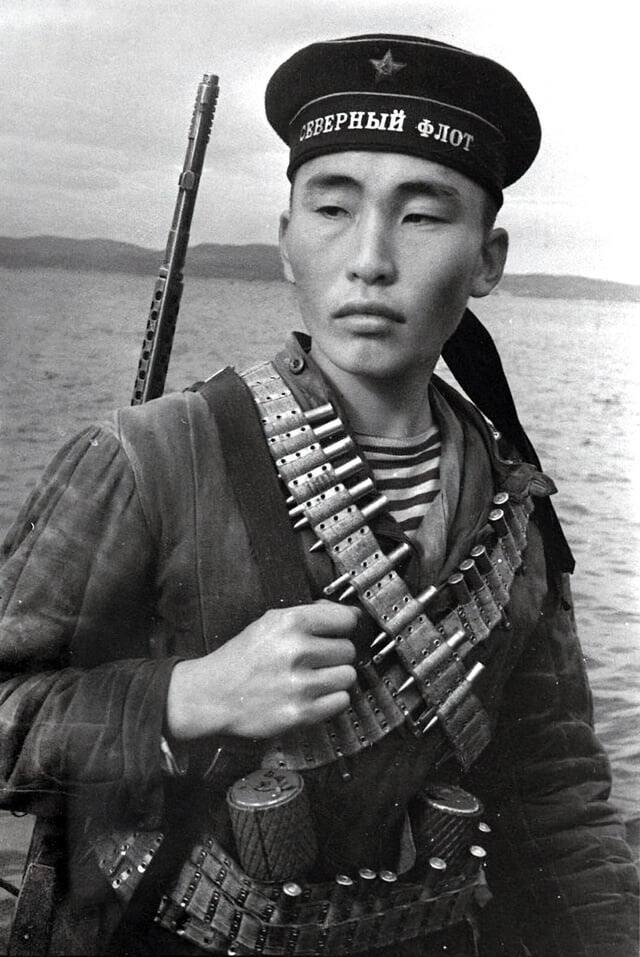 In alto: La più famosa immagine scattata a Radna Budaevich Ayusheev ad inizio ottobre 1944 a bordo di un peschereccio convertito in nave da sbarco dalla Flotta del Nord. Il giovane ventiduenne è armato con un fucile semiautomatico SVT-40 e ha due bombe a mano offensiva RGD-33 nel cinturone delle munizioni. Sul berretto la scritta Северный флот (Flotta del Nord). (Foto moypolk.ru)