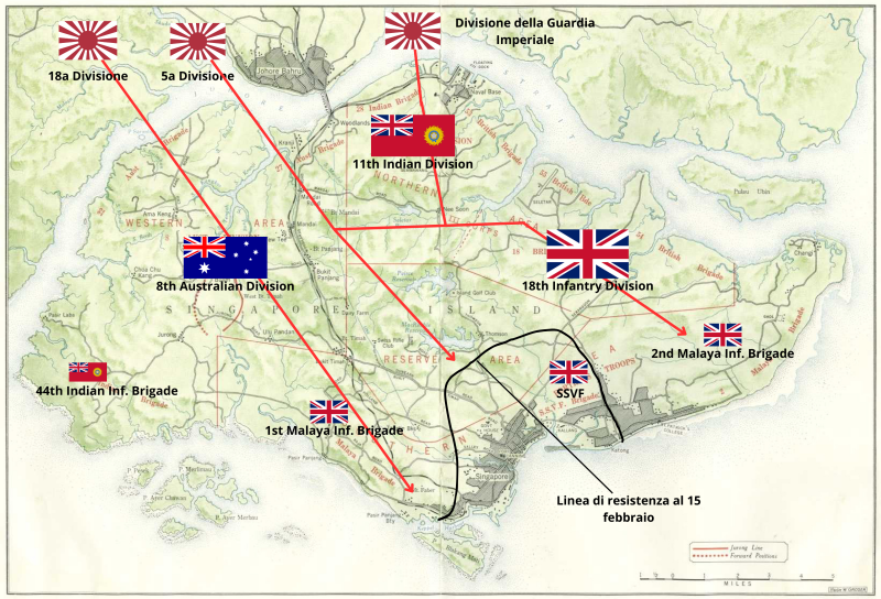 A sinistra/In alto: Forze del Commonwealth e giapponesi coinvolte nell’assedio di Singapore del febbraio 1942. Le divisioni in mappa erano sotto organico dopo la dura ritirata e gli scontri in Malesia ad eccezione della 18th Infantry Division che giunse a Singapore tra fine gennaio e inizio febbraio. A difesa della città erano stanziate anche la 1st e 2nd Malaya Infantry Brigade, i volontari della Straits Settlements Volunteer Force (SSVF) e la 44th Indian Infantry Division. L’attacco nipponico scattò l’8 febbraio con le divisioni 5a, 18a e della Guardia Imperiale che avanzarono velocemente verso Singapore portando la fortezza alla resa il giorno 15. (Mappa tratta da L. Wigmore, Australia in the War of 1939–1945 Volume IV, Chapter 14 – The Japanese Thrust, Canberra, AWM, 1957 modificata dall’Autore)