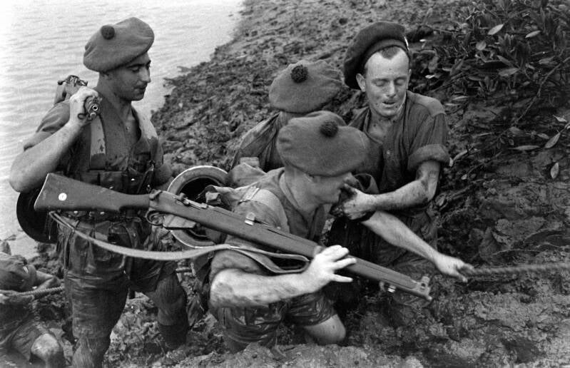 A destra/In basso: Soldati del 2nd Battalion, Argyll and Sutherland Highlanders, durante il difficoltoso guado di un fiume in Malesia nel corso di un addestramento alla fine del 1941. Notare l’armamento principale composto dal fucile Lee Enfield SMLE Mk.III calibro .303 British. (Foto Carl Mydans via LIFE Magazine)