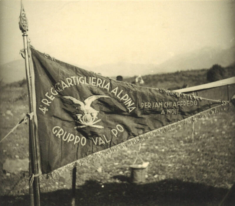 A destra/In basso: Il gagliardetto del Gruppo artiglieria alpina “Val Po” intestato al caduto Chiaffredo Persan nel 1940 (Foto Archivio famiglia Bennicelli)
